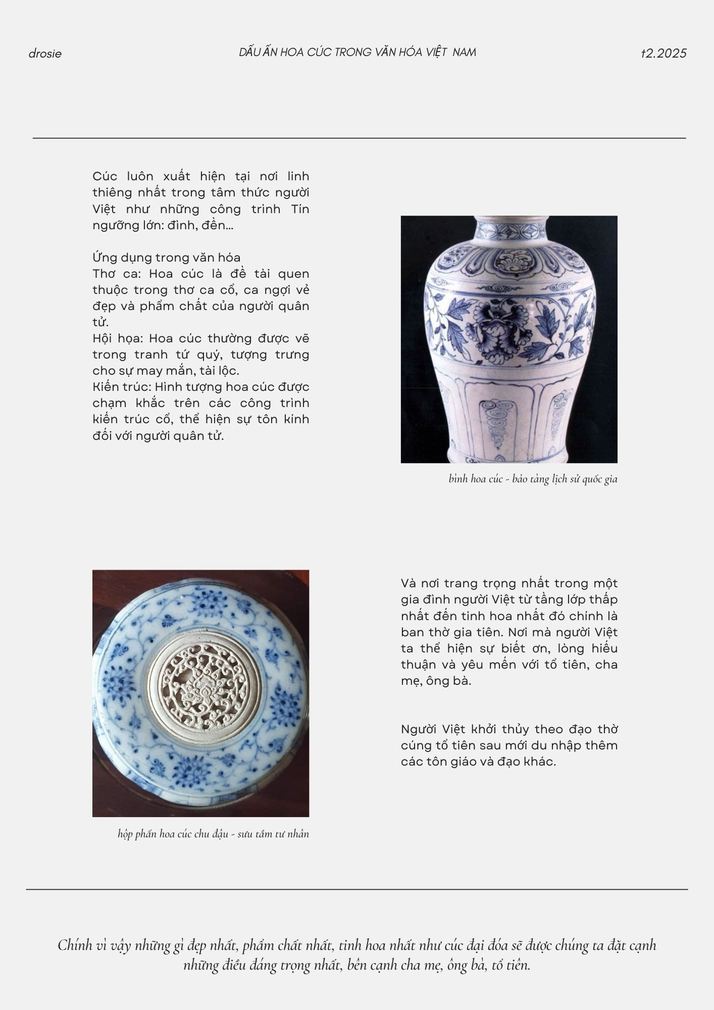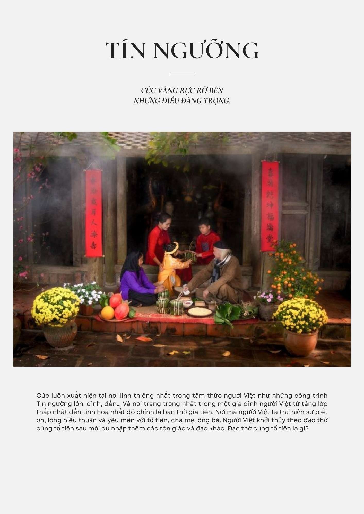 Cúc luôn xuất hiện tại nơi linh thiêng nhất trong tâm thức người Việt như những công trình Tín ngưỡng lớn: đình, đền… Và nơi trang trọng nhất trong một gia đình người Việt từ tầng lớp thấp nhất đến tinh hoa nhất đó chính là ban thờ gia tiên. Nơi mà người Việt ta thể hiện sự biết ơn, lòng hiếu thuận và yêu mến với tổ tiên, cha mẹ, ông bà. Người Việt khởi thủy theo đạo thờ cúng tổ tiên sau mới du nhập thêm các tôn giáo và đạo khác.