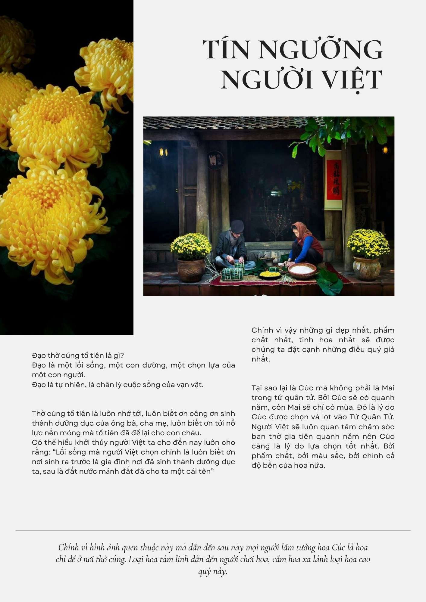 Tại sao lại là Cúc mà không phải là các Mai trong tứ quân tử. Bởi Cúc sẽ có quanh năm, còn Mai sẽ chỉ có mùa. Đó là lý do Cúc được chọn và lọt vào Tứ Quân Tử. Người Việt thì sẽ luôn quan tâm chăm sóc ban thờ gia tiên quanh năm nên Cúc càng là lý do lựa chọn tốt nhất. Bởi phẩm chất, bởi màu sắc, bởi chính cả độ bền của hoa nữa.