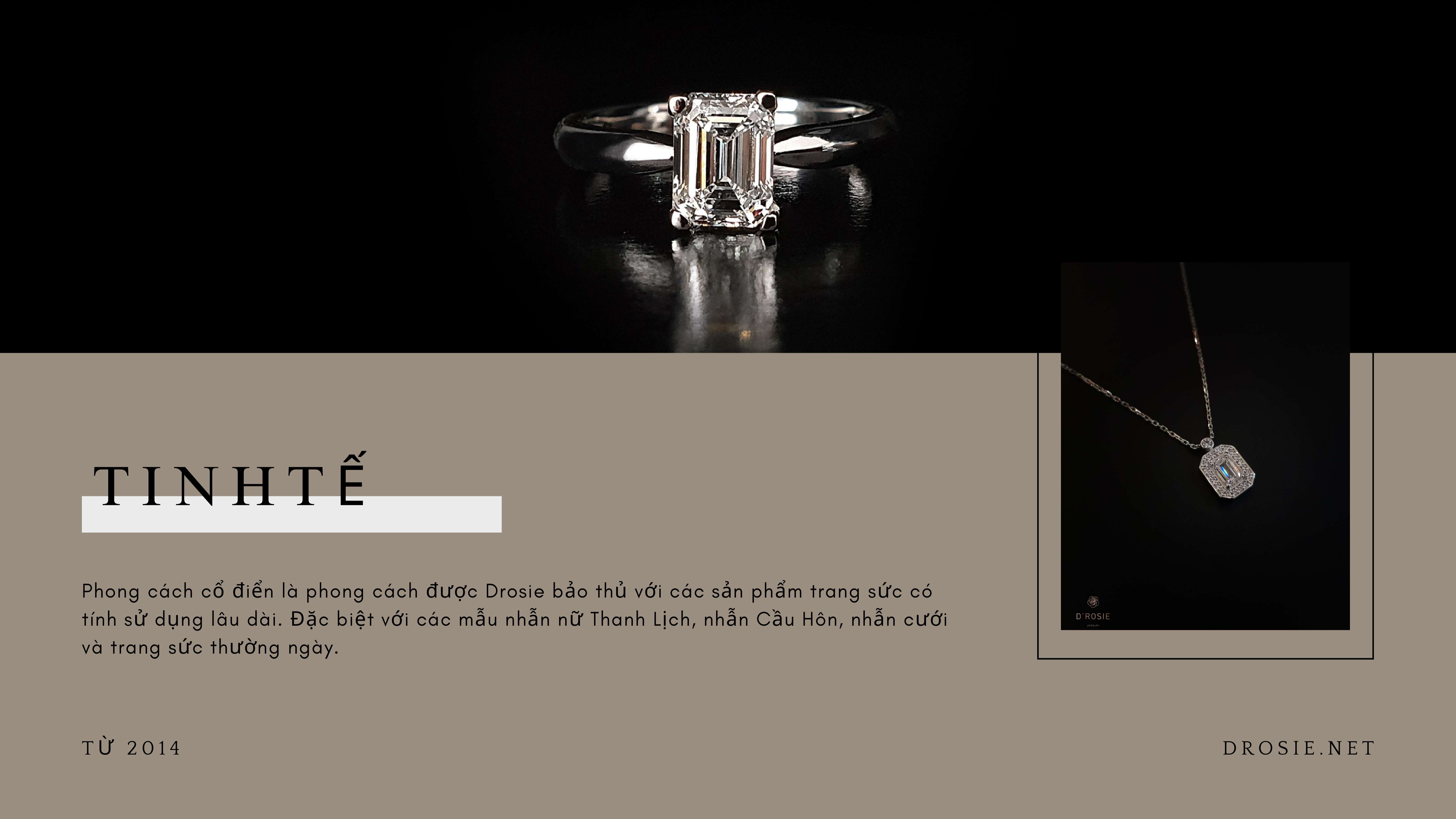 Thương hiệu chế tác Kim Hoàn Hà Nội từ năm 2014. Ứng dụng công nghệ mới nhưng giá trị luôn tập trung chính vào tính thủ công mỹ nghệ của thợ kim hoàn trong nước. Ở DROSIE chúng tôi cần tối thiểu 15 ngày cho một sản phẩm trang sức cơ bản. Sản phẩm tạo ra mang phong cách cá nhân của từng khách hàng nhưng không thoát khỏi hơi thở Đông Dương từ thương hiệu.