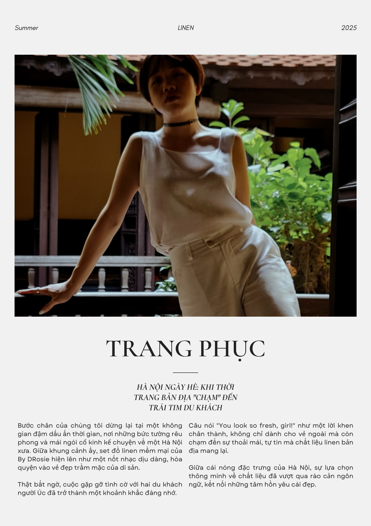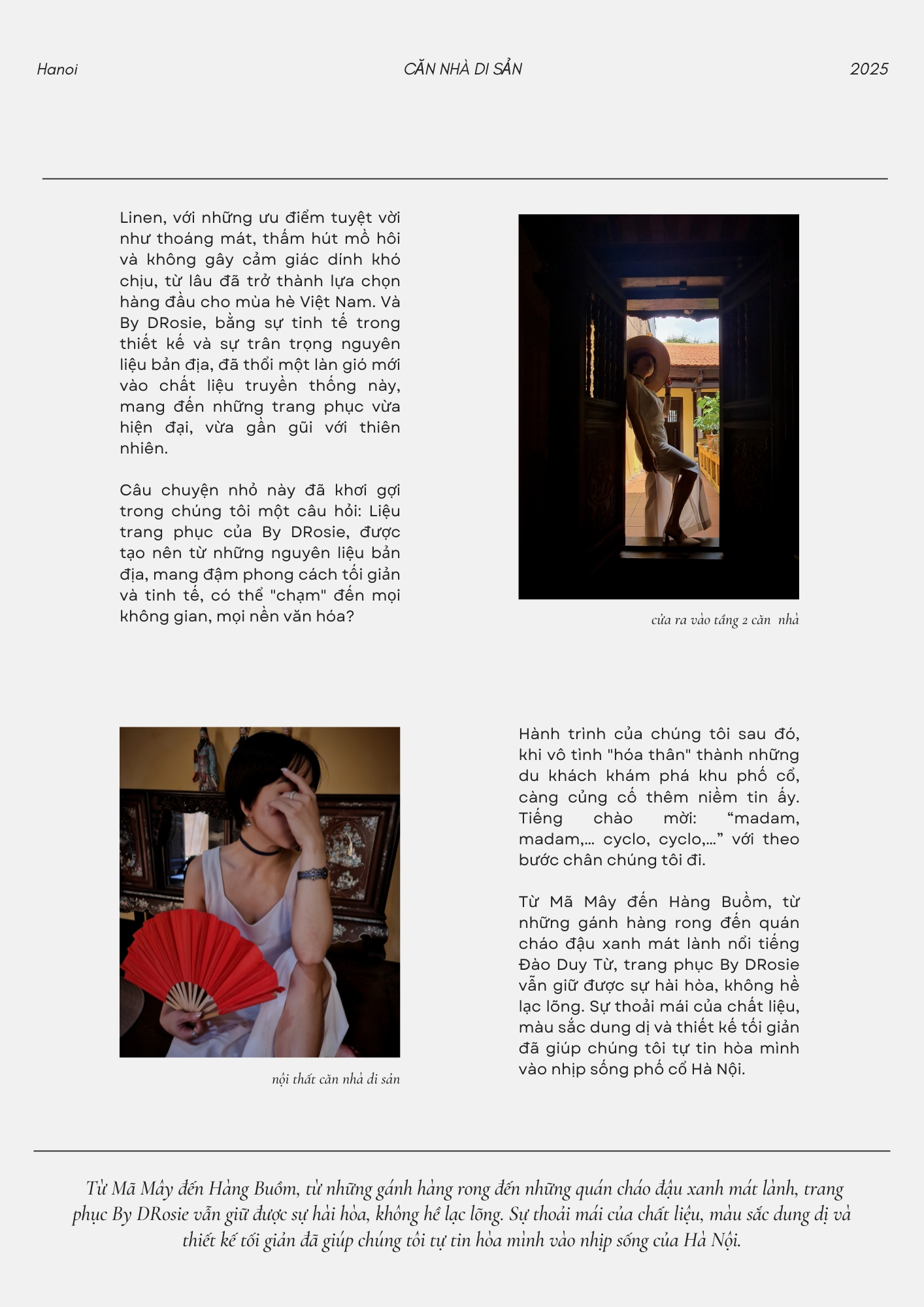 Câu chuyện ngày hè ở Hà Nội đã cho chúng tôi thấy rằng, thời trang không chỉ là những bộ cánh lộng lẫy, mà còn là sự kết nối giữa con người và văn hóa. Bằng việc trân trọng nguyên liệu bản địa và theo đuổi phong cách tối giản, By Drosie không chỉ tạo ra những sản phẩm đẹp mà còn góp phần lan tỏa những giá trị văn hóa Việt Nam đến với bạn bè quốc tế. Và hơn hết, đó là minh chứng cho thấy, vẻ đẹp tinh tế và bền vững luôn có sức mạnh lay động trái tim của những người yêu cái đẹp, dù họ đến từ bất kỳ đâu trên thế giới.