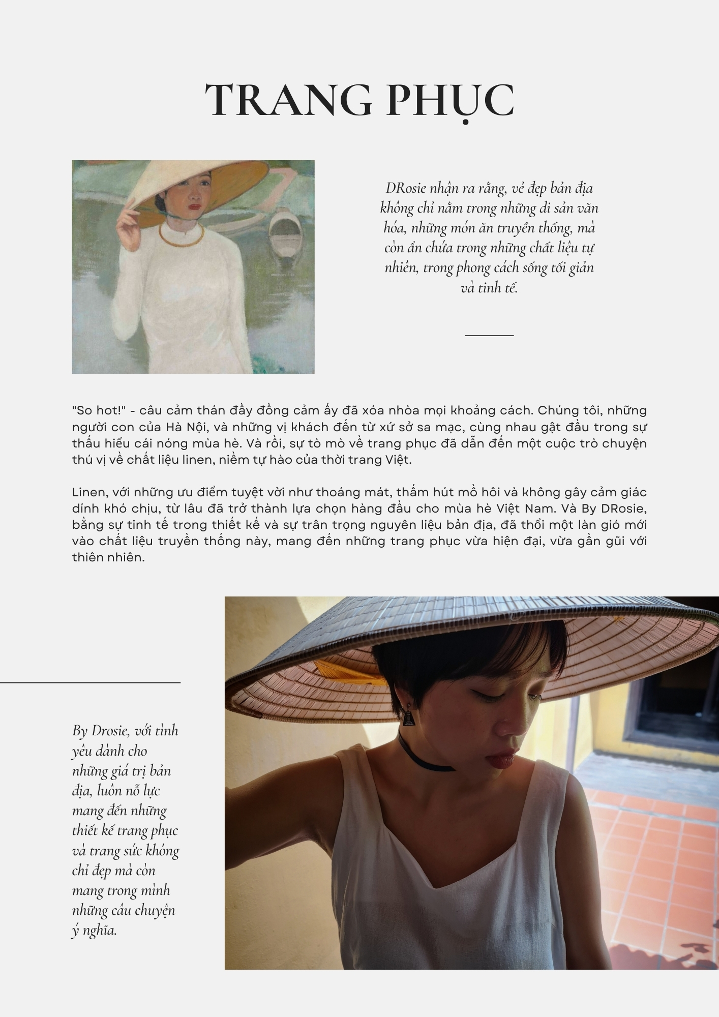 Hành trình của chúng tôi sau đó, khi vô tình "hóa thân" thành những du khách khám phá khu phố cổ, càng củng cố thêm niềm tin ấy. Tiếng chào mời: “madam, madam,… cyclo, cyclo,…” với theo bước chân chúng tôi đi. Từ Mã Mây đến Hàng Buồm, từ những gánh hàng rong đến những quán cháo đậu xanh mát lành, trang phục By Drosie vẫn giữ được sự hài hòa, không hề lạc lõng. Sự thoải mái của chất liệu, màu sắc dung dị và thiết kế tối giản đã giúp chúng tôi tự tin hòa mình vào nhịp sống của Hà Nội.