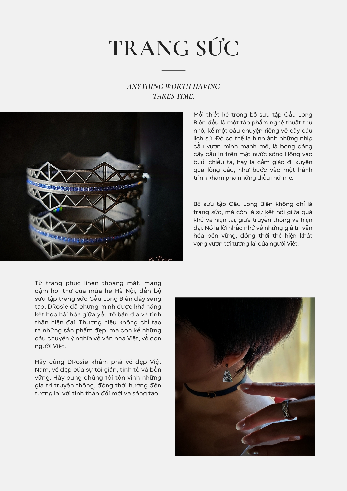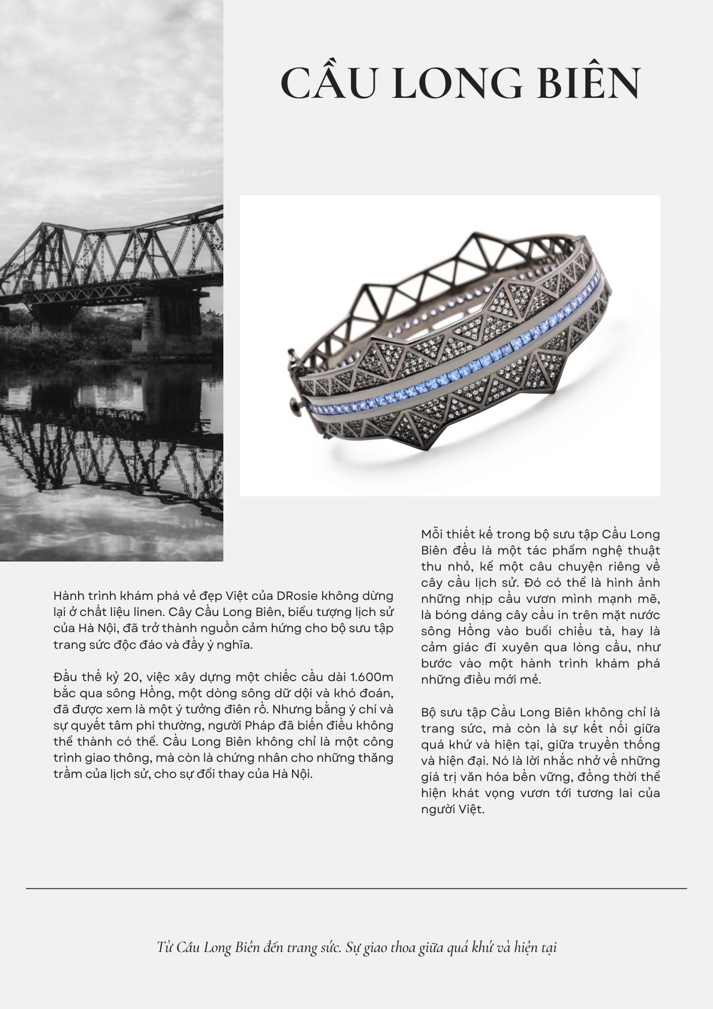 Drosie, với trái tim của một người con Hà Nội, đã nhìn thấy ở Cầu Long Biên một câu chuyện về sức mạnh của ý tưởng, về tinh thần tiên phong và khát vọng vươn lên. Bộ sưu tập trang sức Cầu Long Biên ra đời, không chỉ tái hiện vẻ đẹp kiến trúc độc đáo của cây cầu, mà còn gửi gắm những thông điệp sâu sắc về lịch sử, văn hóa và con người Việt Nam.