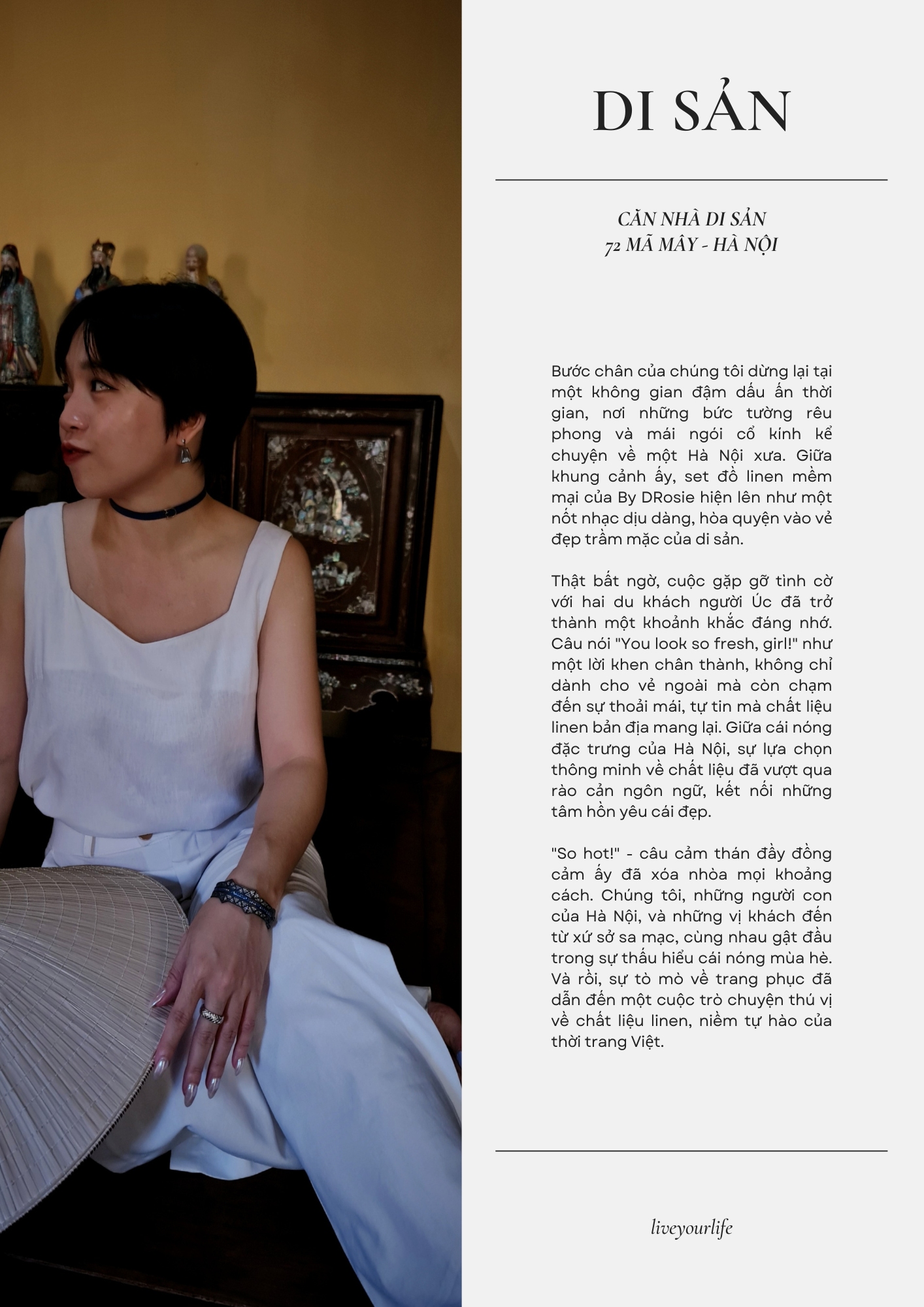 Giữa những ngày hè oi ả, khi cái nóng như muốn tan chảy mọi thứ, ekip Drosie đã tìm thấy nguồn cảm hứng bất ngờ từ chính những điều bình dị nhất của Hà Nội. Buổi chụp ảnh sản phẩm mới tại Ngôi Nhà Di Sản 72 Mã Mây đã trở thành một cuộc gặp gỡ thú vị với hai vị khách du lịch người Úc. Sự chân thành trong lời khen ngợi dành cho trang phục linen của mẫu Drosie đã khẳng định một điều: vẻ đẹp bản địa, sự thoải mái và tính ứng dụng cao luôn có sức hút đặc biệt.