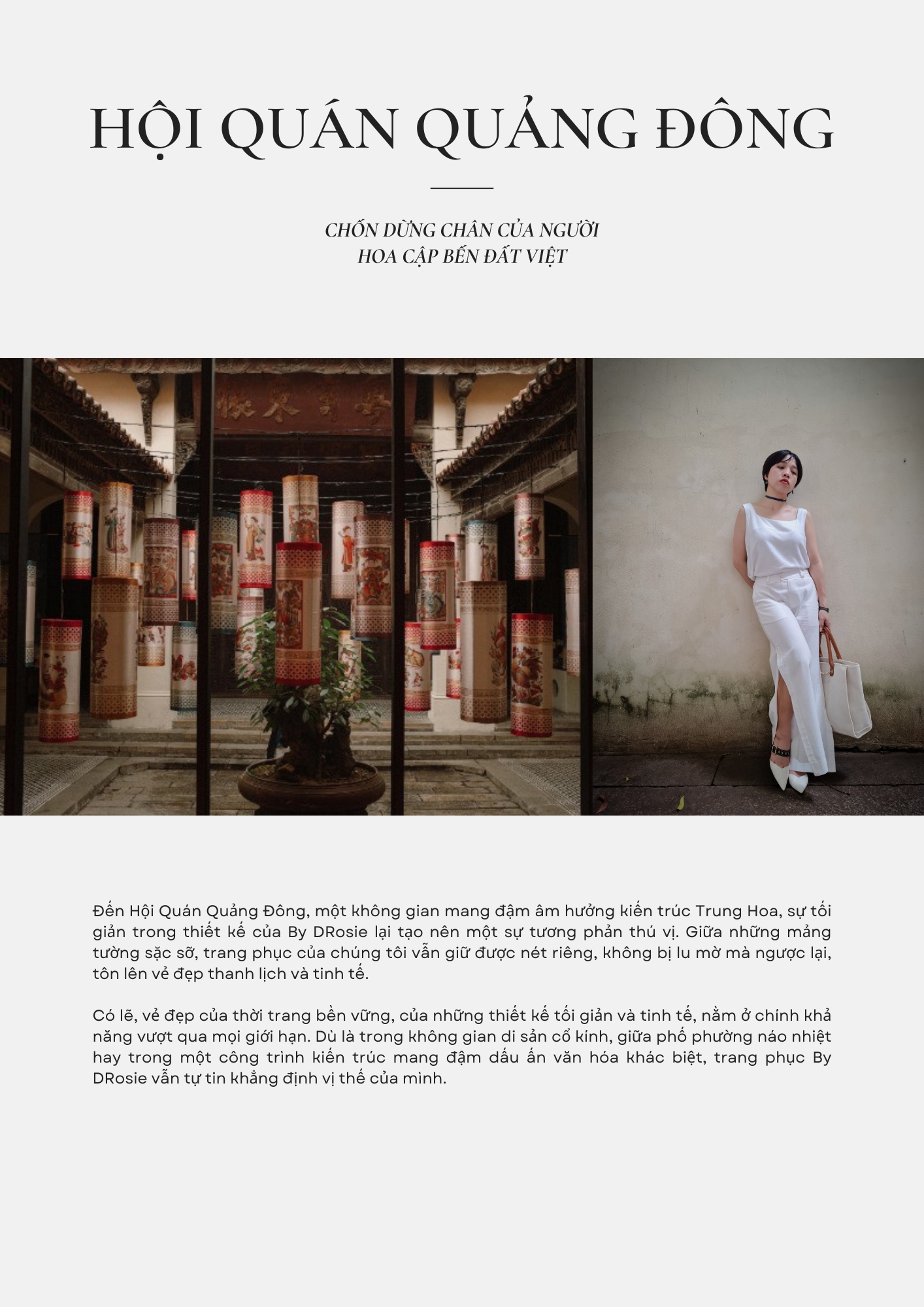 Đến Hội Quán Quảng Đông, một không gian mang đậm âm hưởng kiến trúc Trung Hoa, sự tối giản trong thiết kế của By Drosie lại tạo nên một sự tương phản thú vị. Giữa những mảng tường sặc sỡ, trang phục của chúng tôi vẫn giữ được nét riêng, không bị lu mờ mà ngược lại, tôn lên vẻ đẹp thanh lịch và tinh tế.
