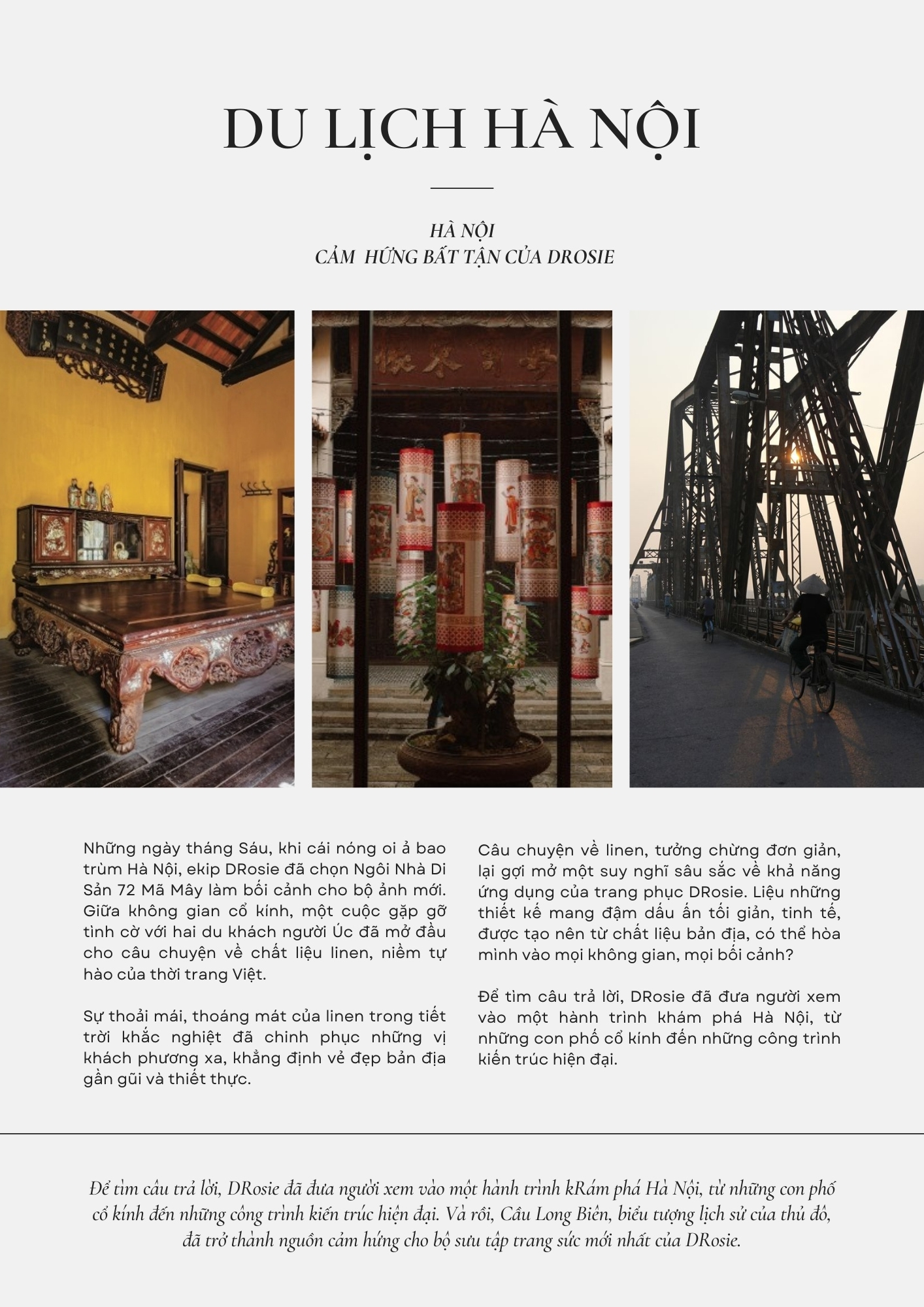 Chất liệu linen, một phần không thể thiếu trong mùa hè của người Việt, đã được Drosie khéo léo đưa vào những thiết kế của mình. Sự thoáng mát, khả năng thấm hút mồ hôi và cảm giác dễ chịu mà linen mang lại không chỉ phù hợp với khí hậu Việt Nam mà còn chinh phục được những vị khách quốc tế. Câu chuyện nhỏ này đã khơi gợi trong Drosie niềm tự hào về những giá trị bản địa và thôi thúc thương hiệu khám phá sâu hơn vẻ đẹp tiềm ẩn của văn hóa Việt.