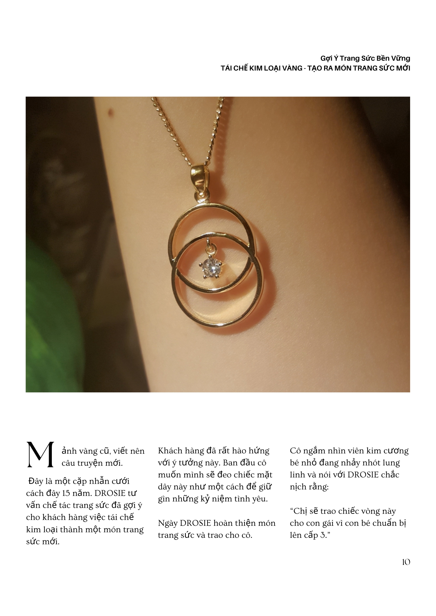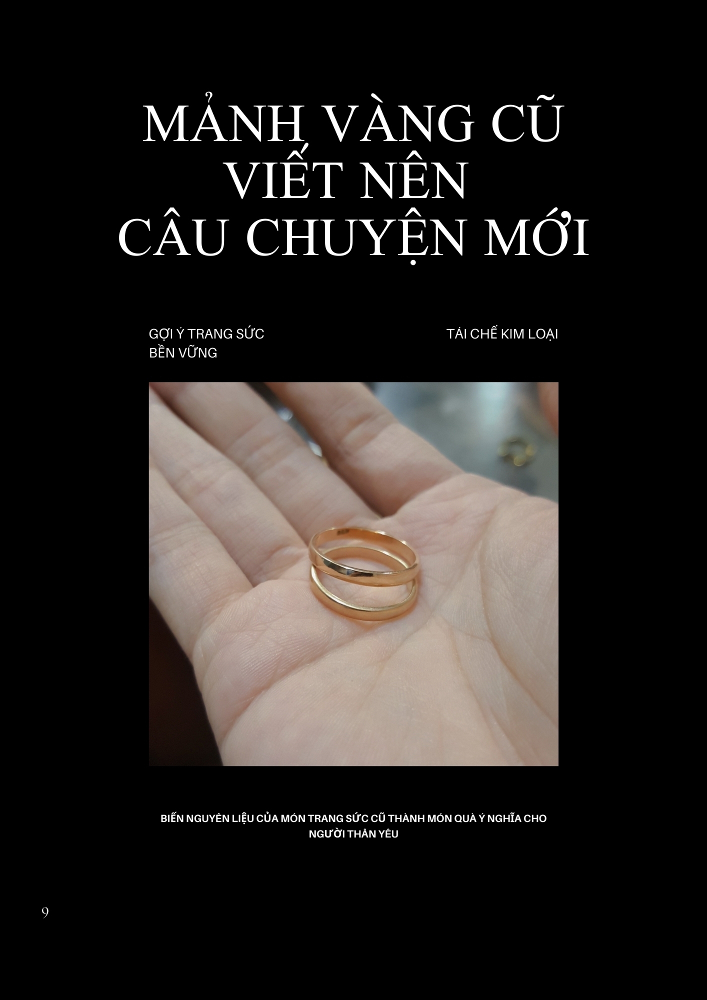• "Nhẫn kim loại tái chế. Không gì tuyệt vời và ý nghĩa hơn nếu từ mảnh vàng cũ, viết nên câu chuyện mới. Biến nguyên liệu của món trang sức cũ thành món quà ý nghĩa cho người thân yêu. "
