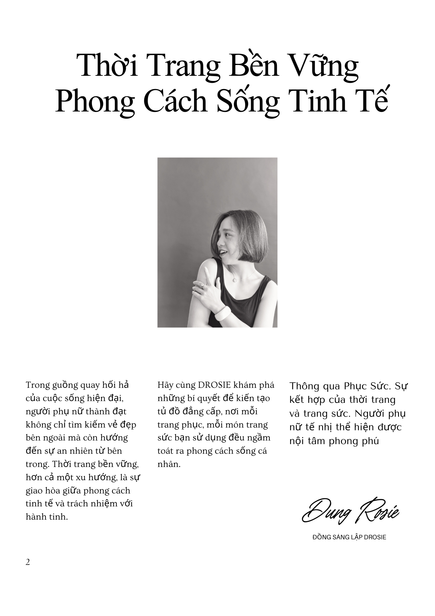 "Trong guồng quay hối hả của cuộc sống hiện đại, người phụ nữ thành đạt không chỉ tìm kiếm vẻ đẹp bên ngoài mà còn hướng đến sự an nhiên từ bên trong. Thời trang bền vững, hơn cả một xu hướng, là sự giao hòa giữa phong cách tinh tế và trách nhiệm với hành tinh. Hãy cùng DROSIE khám phá những bí quyết để kiến tạo tủ đồ đẳng cấp, nơi mỗi trang phục, mỗi món trang sức bạn sử dụng đều ngầm toát ra phong cách sống cá nhân."