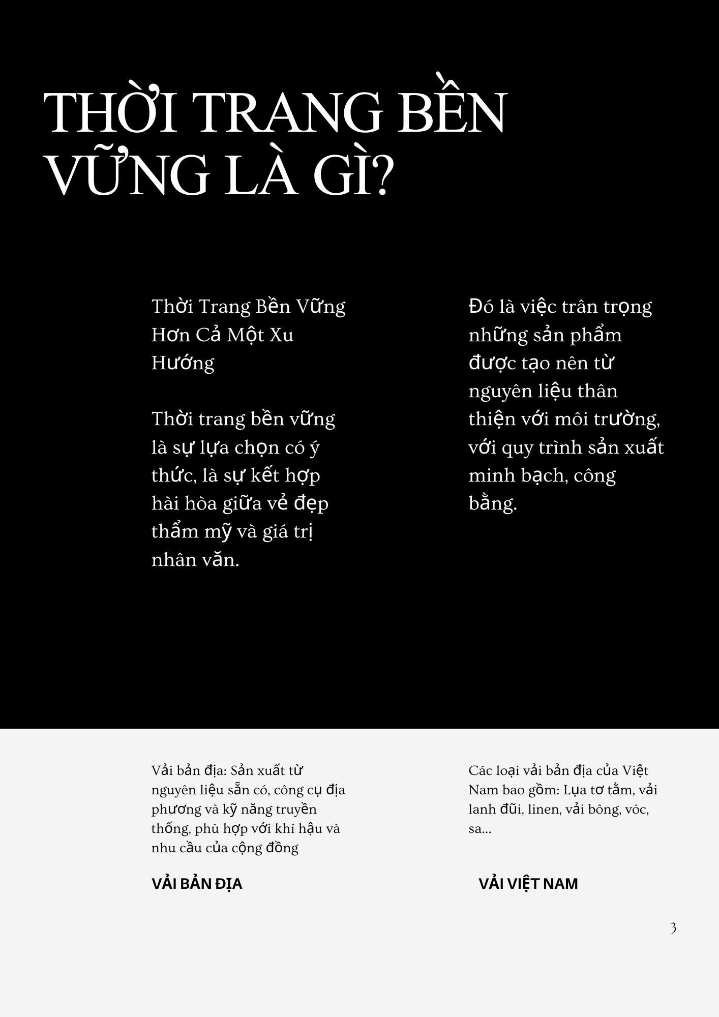 • "Trong khi thời trang nhanh (fast fashion) để lại những hệ lụy nặng nề cho môi trường, thời trang bền vững mang đến giải pháp thanh lịch và trách nhiệm. Đó là sự lựa chọn của những quý cô thông thái, những người hiểu rằng vẻ đẹp thực sự đến từ sự cân bằng và hài hòa."