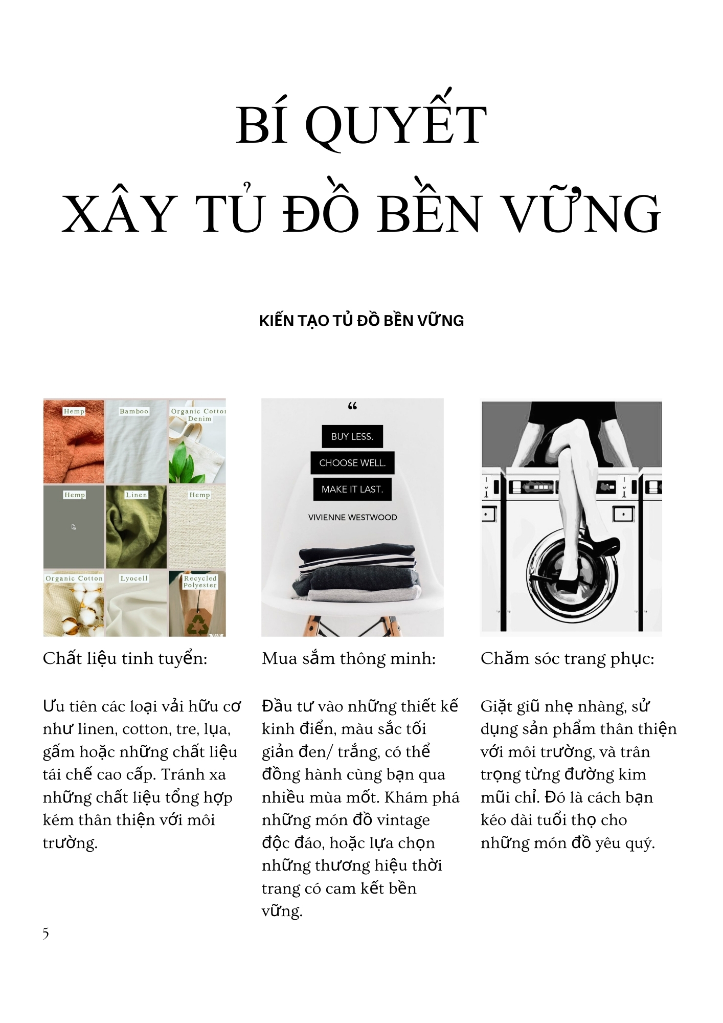 • Mua sắm thông minh: "Đầu tư vào những thiết kế kinh điển, có thể đồng hành cùng bạn qua nhiều mùa mốt. Khám phá những món đồ vintage độc đáo, hoặc lựa chọn những thương hiệu thời trang có cam kết bền vững."