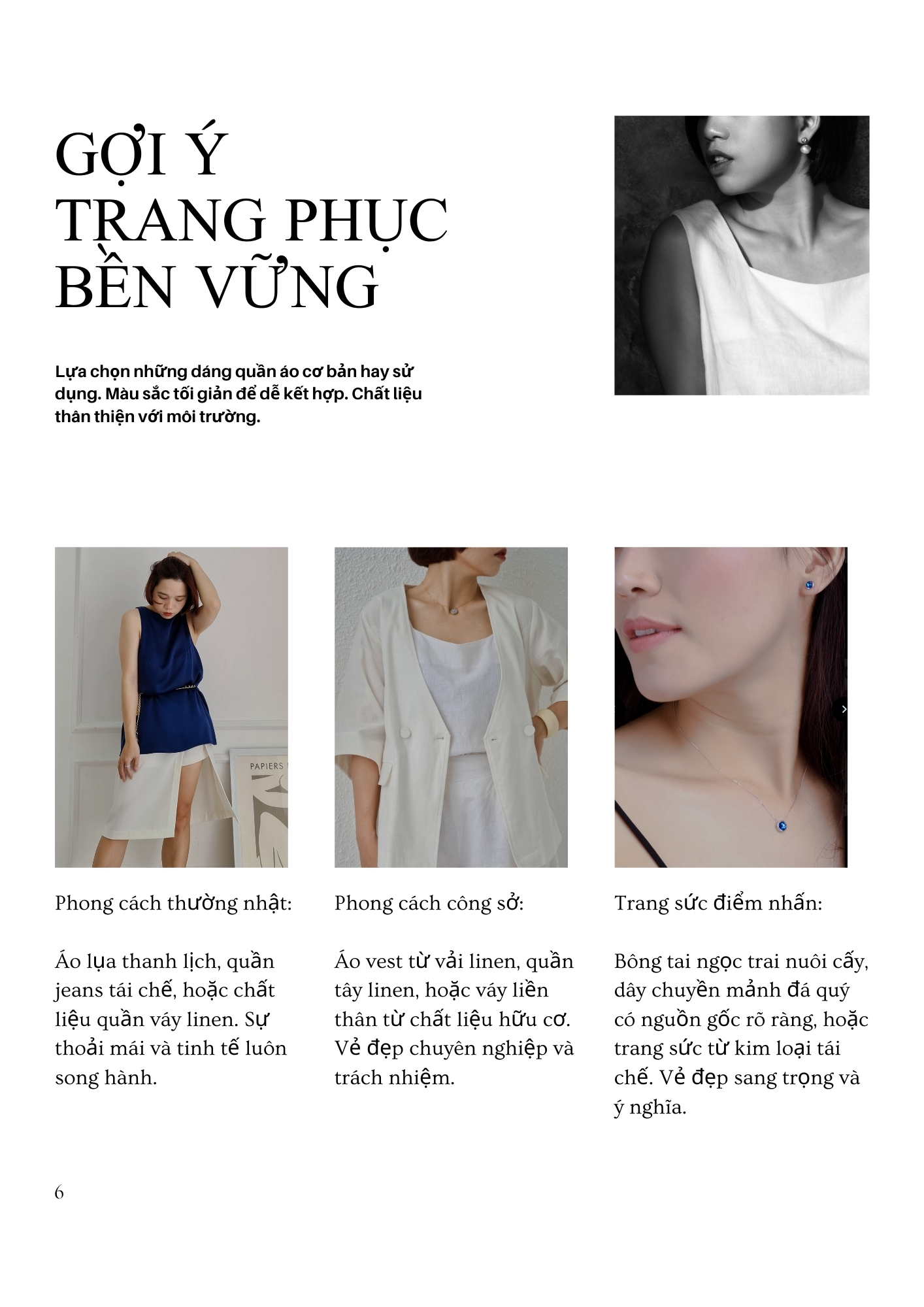 • Trang sức điểm nhấn: "Bông tai ngọc trai nuôi cấy, vòng cổ đá quý có nguồn gốc rõ ràng, hoặc trang sức từ kim loại tái chế. Vẻ đẹp sang trọng và ý nghĩa."