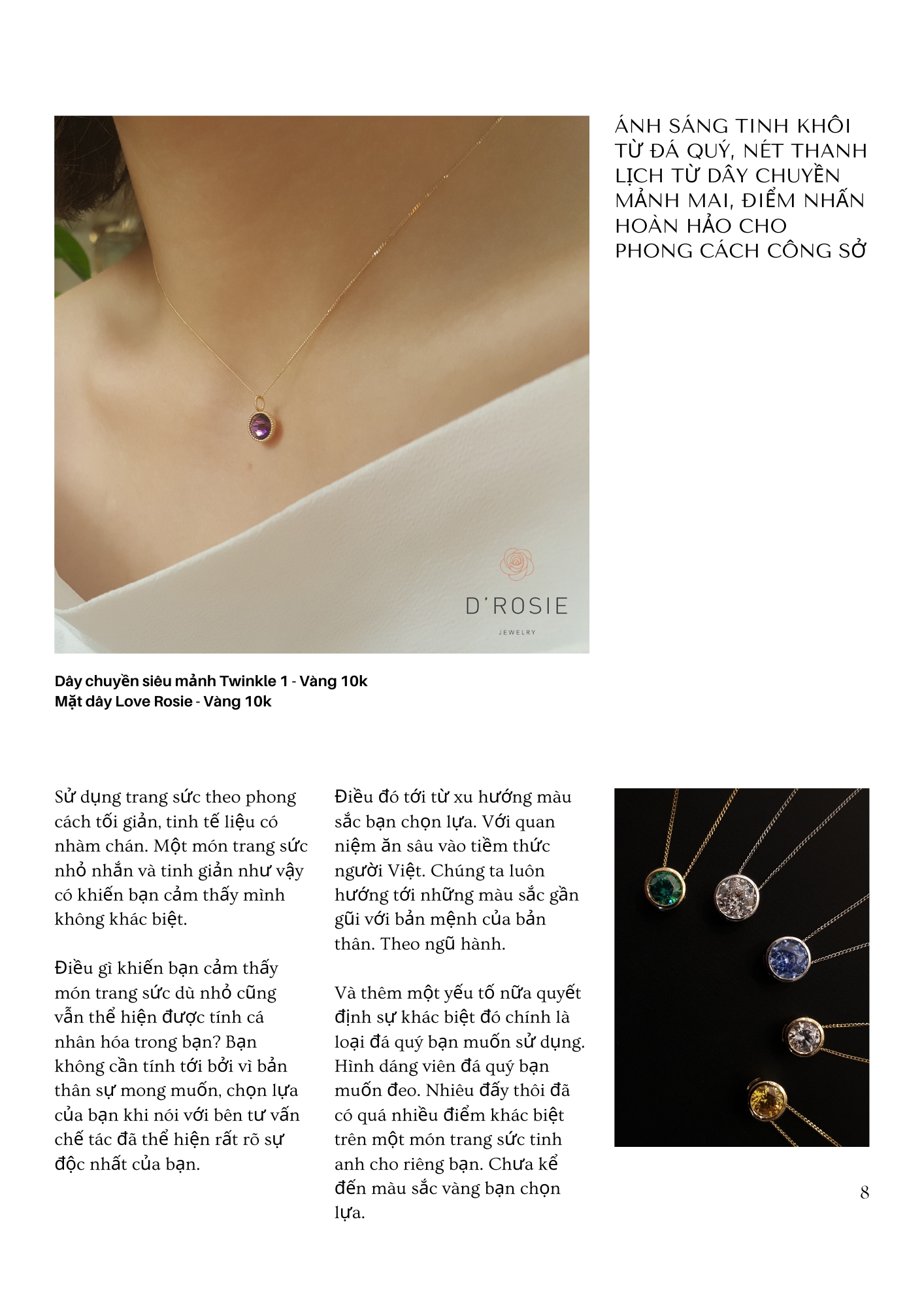 • "Ánh sáng tinh khôi từ đá quý, nét thanh lịch từ dây chuyền mảnh mai, điểm nhấn hoàn hảo cho phong cách công sở."